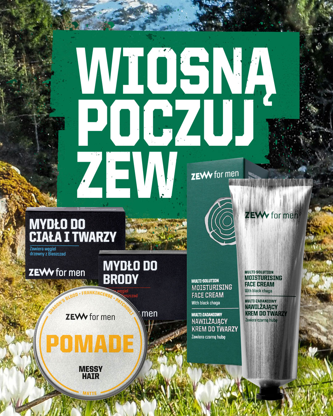 To węgiel drzewny i czarna huba w innowacyjnych produktach dopasowanych do męskich potrzeb. To najlepsze akcesoria i praktyczne zestawy. To eksperci, spotkania w barberowozie i festiwal ZEW się budzi, organizowany w sercu Bieszczad. Na granicy cywilizacji i natury, miasta i dziczy widzimy jedność naszej męskiej natury. Właśnie tam czujemy się na miejscu – czujemy ZEW swojej natury i swojej drogi.
