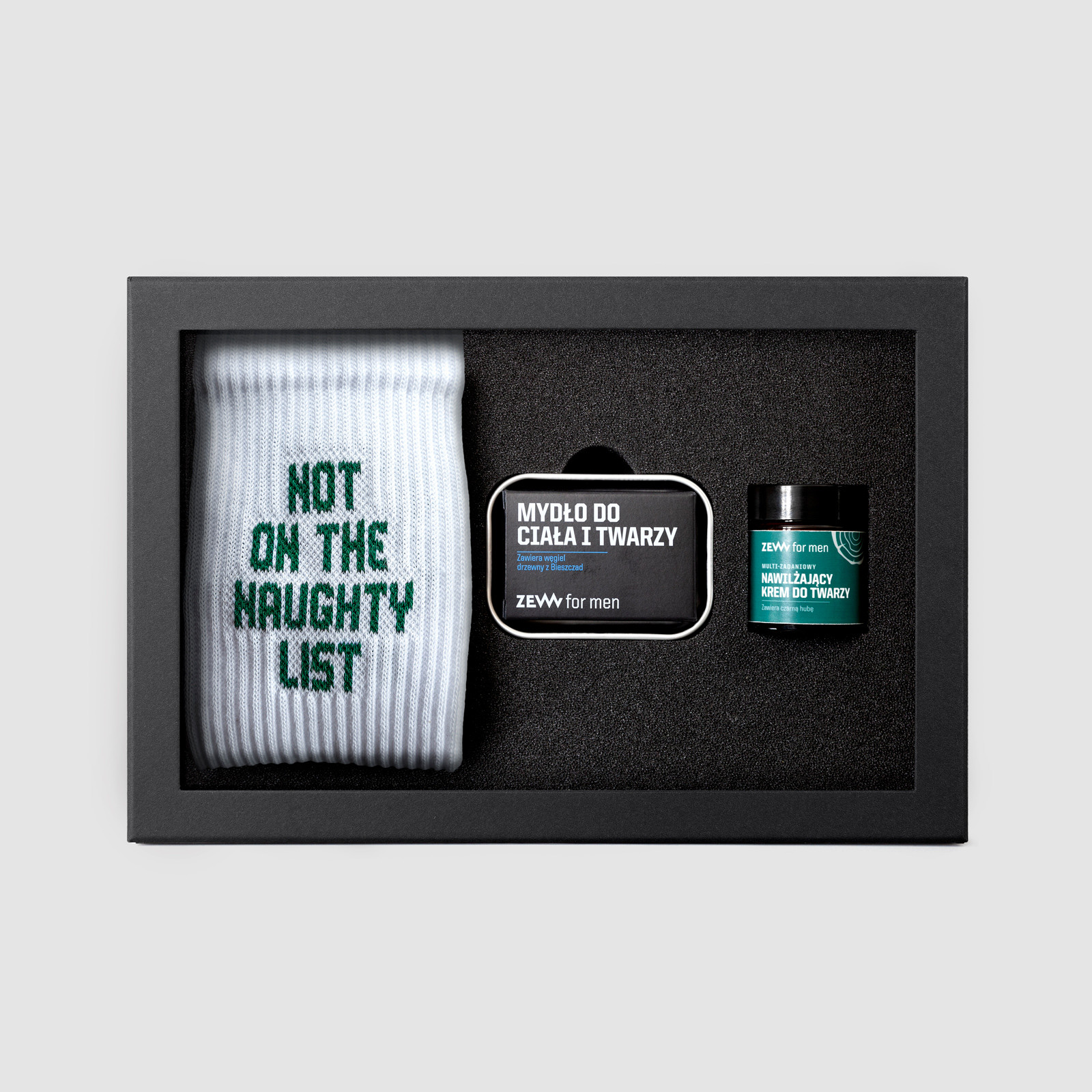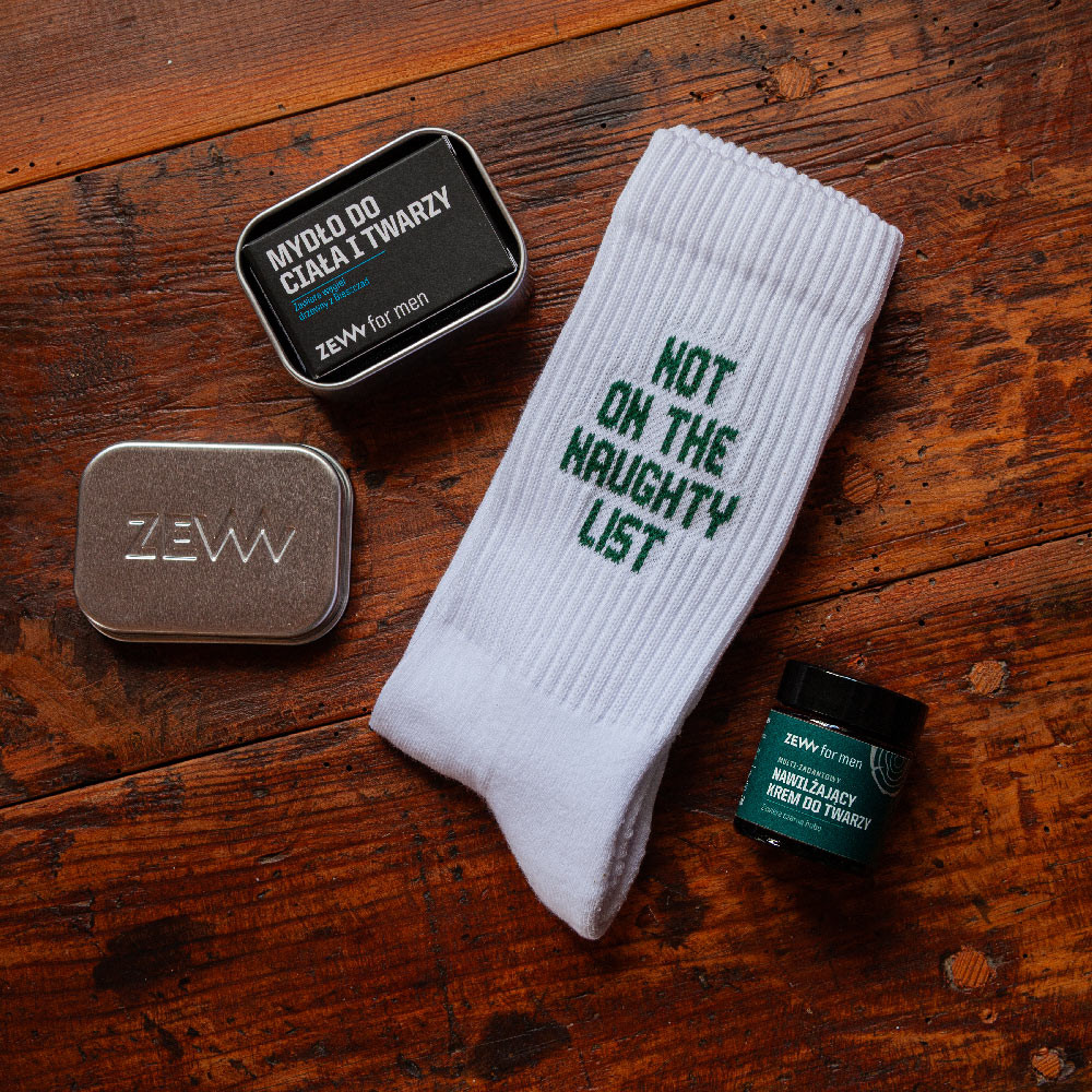 Zestaw zawiera wszystko, czego potrzeba, by zadbać o skórę i zachować świeżość w każdych warunkach. A skarpetki ZEW for men × WARSAW SAINTS „Not on the Naughty List” dodają całości lekkości i humoru – idealny akcent na prezent.