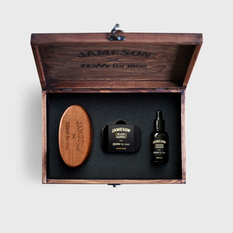 Elegancki zestaw prezentowy Jameson Black Barrel × ZEW for men to klasyczna pielęgnacja brody w wyjątkowym wydaniu. Olejek i balsam o głębokim aromacie whiskey sour zamknięte są w eleganckim drewnianym pudełku. Całość uzupełnia szczotka z naturalnym włosiem z dzika — wszystko, czego potrzeba do codziennej, porządnej pielęgnacji.