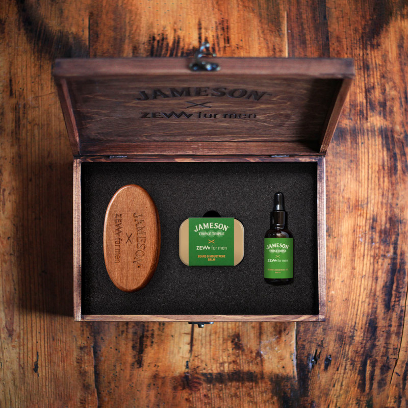 Elegancki zestaw prezentowy Jameson Triple Triple × ZEW for men to klasyczna pielęgnacja brody w wyjątkowym wydaniu. Olejek i balsam o charakterystycznym aromacie czekolady i drewna, inspirowanym whiskey Jameson Triple Triple zamknięte są w eleganckim drewnianym pudełku. Całość uzupełnia szczotka z naturalnym włosiem z dzika — wszystko, czego potrzeba do codziennej, porządnej pielęgnacji.