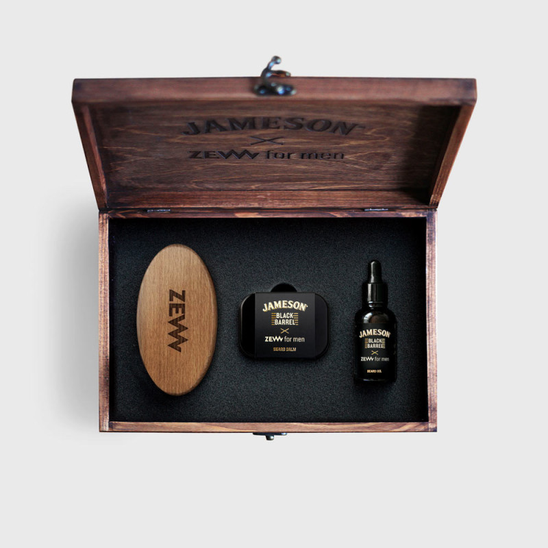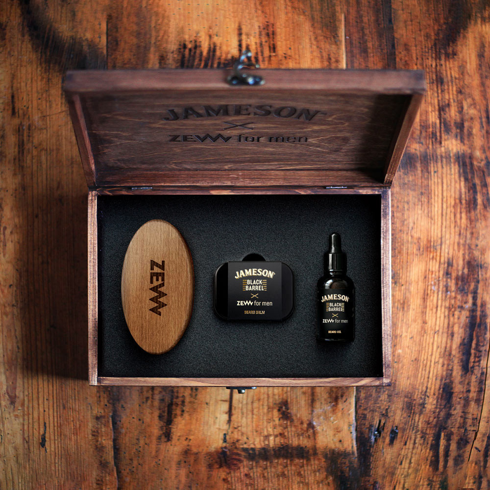 Elegancki zestaw prezentowy Jameson Black Barrel × ZEW for men to klasyczna pielęgnacja brody w wyjątkowym wydaniu. Olejek i balsam o głębokim aromacie whiskey sour zamknięte są w eleganckim drewnianym pudełku. Całość uzupełnia szczotka z naturalnym włosiem z dzika — wszystko, czego potrzeba do codziennej, porządnej pielęgnacji.