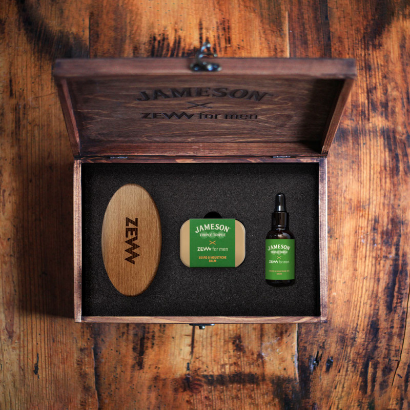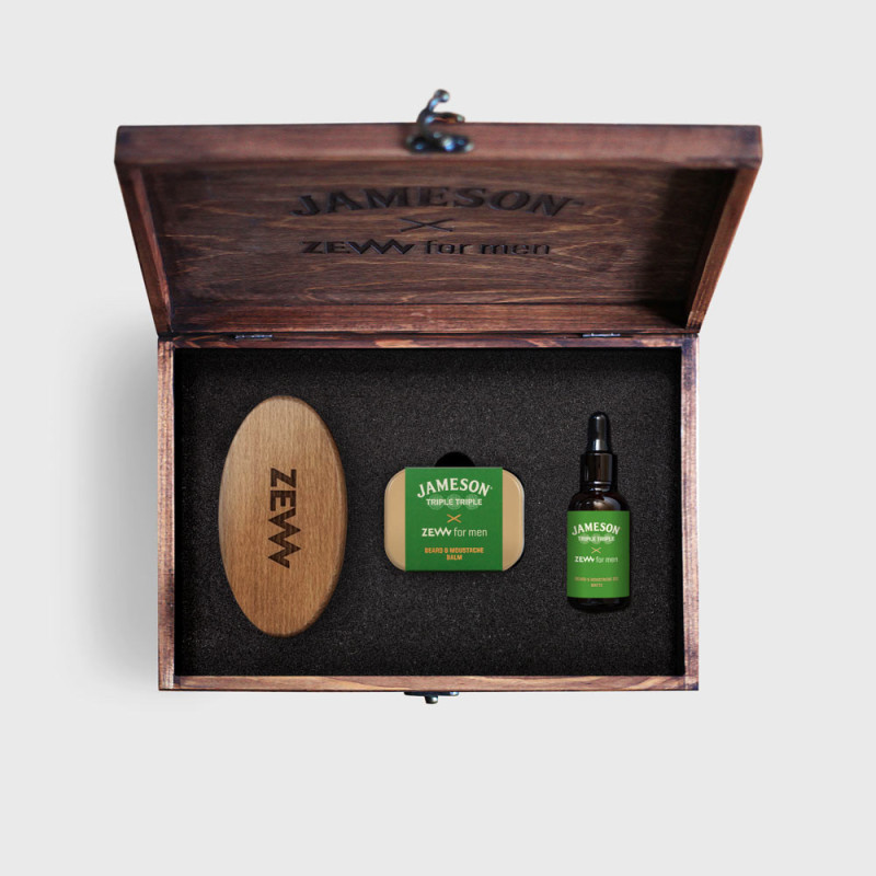Elegancki zestaw prezentowy Jameson Triple Triple × ZEW for men to klasyczna pielęgnacja brody w wyjątkowym wydaniu. Olejek i balsam o charakterystycznym aromacie czekolady i drewna, inspirowanym whiskey Jameson Triple Triple zamknięte są w eleganckim drewnianym pudełku. Całość uzupełnia szczotka z naturalnym włosiem z dzika — wszystko, czego potrzeba do codziennej, porządnej pielęgnacji.